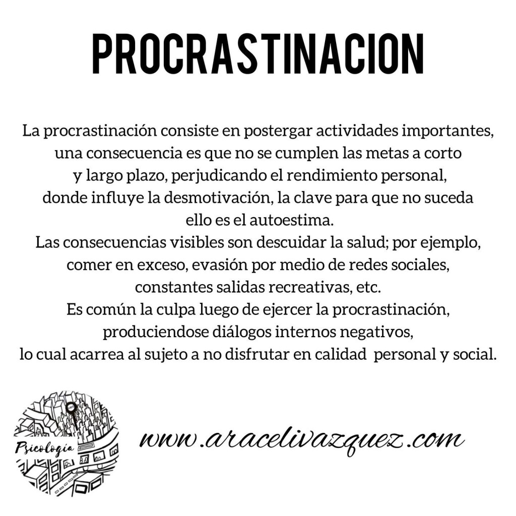 La procrastinación consiste en postergar actividades importantes, una consecuencia es que no se cumplen las metas a corto y largo plazo, perjudicando el rendimiento personal, donde influye la desmotivación, la clave para que no suceda ello es el autoestima.